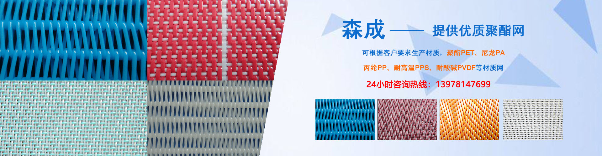 同時主導產品還有:聚酯成型網,聚酯平織干網、聚酯螺旋干網、聚酯銅絲抗靜電網,主要用于造紙、環(huán)保、印染、洗煤、石油化工、制藥、食品烘干、人造板廠、冶金、電廠脫硫、礦業(yè)、發(fā)酵等行業(yè)。公司產品具有耐酸堿、耐高溫、濾水好、透氣好、尺寸運行穩(wěn)定的特點,憑質優(yōu)價廉及優(yōu)良的售前、售后服務暢銷國內還可以根據(jù)用戶要求生產各種規(guī)格型號的特殊用網,其長度、寬度、密度可根據(jù)用戶要求臨時確定,產品質量上乘,在廣大客戶中享有很高的聲譽。